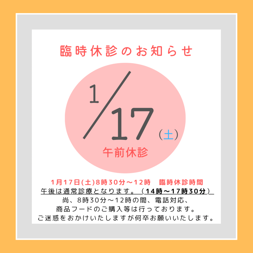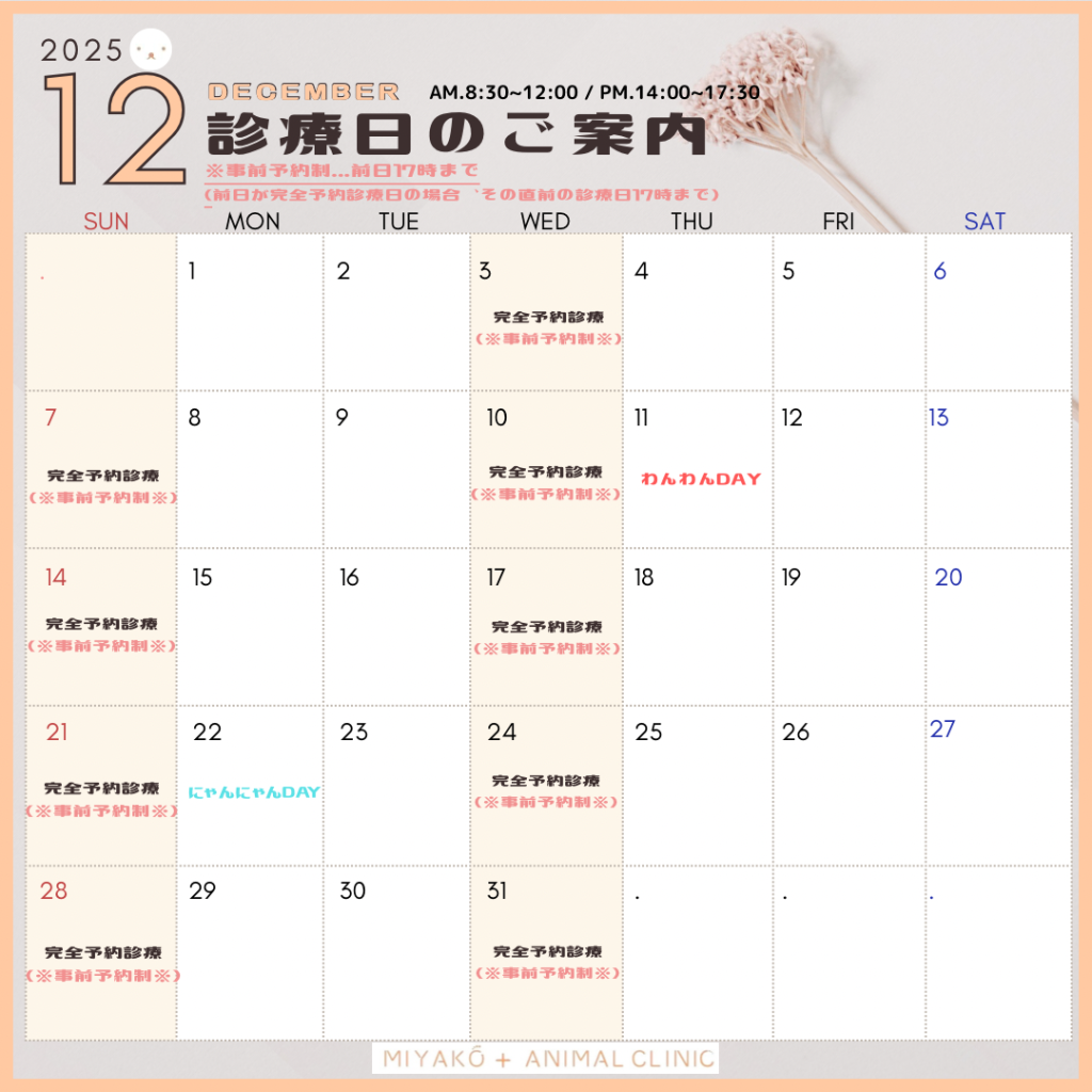 (尚水曜、日曜に関しましては原則休診とさせて頂いておりますが、直前の診療日17時までにお問い合わせ頂きますと、日程調整の上予約診療が可能の日もございます。ご用命の際はお電話もしくは直接病院スタッフまでお問い合わせください。)![]()