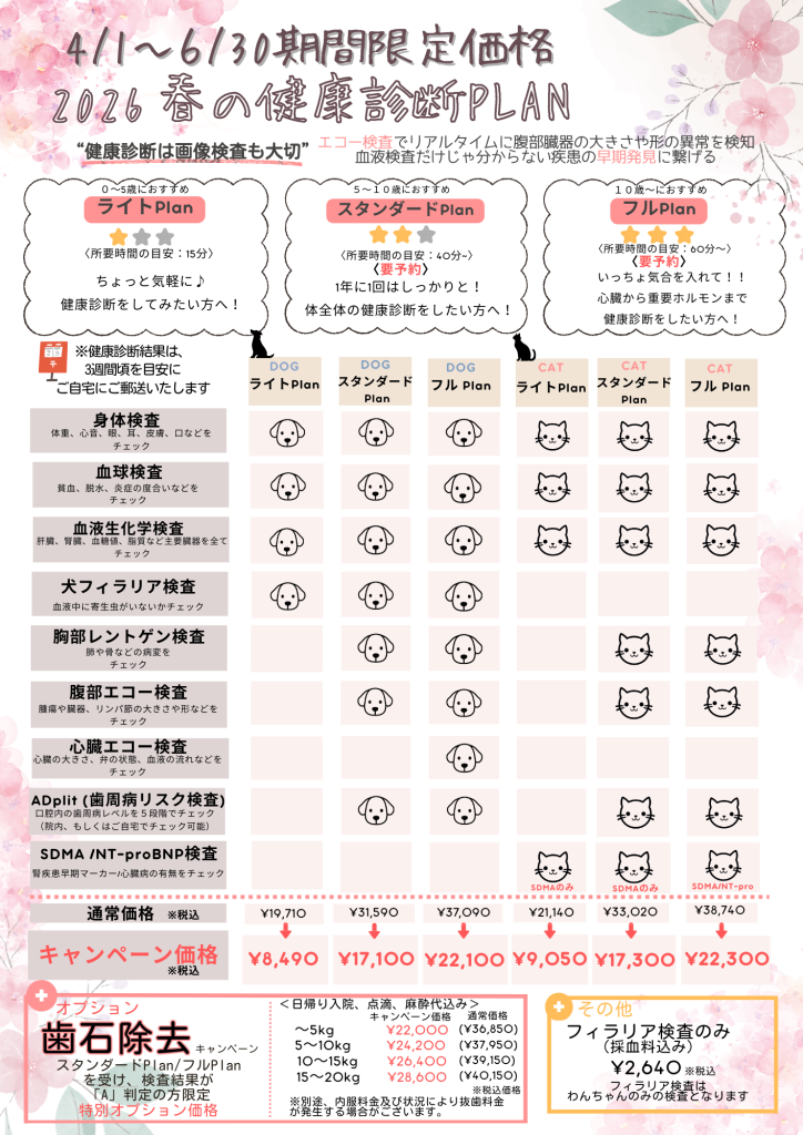 4月から6月まで健診キャンペーンです。ライトプラン以外はお時間を頂戴しますので予めご予約をお願いしております(2025.06末をもって終了しました) お預かりでの検査も可能となっております。合わせて予防薬まとめ買いキャンペーンも実施しております。(2025.06末をもって終了しました)